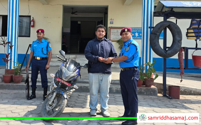 मोटरसाइकल धनीलाई मोटरसाइकल फिर्ता गर्दै प्रहरी ।