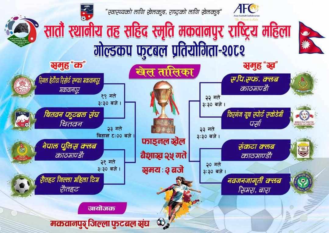 हेटौँडा:सातौं संस्करणको सहीद स्मृति स्थानीय तह मकवानपुर गोल्डकप महिला फुटबल प्रतियोगिता आज शुक्रबारबाट हेटौँडा–६ स्थित गौरिटार रंगशालामा सुरु हुँदैछ । प्रतियोगिताको उद्घाटन खेलमा मकवानपुर र चितवन जिल्लाको टिमबीच खेल हुने भएको छ । आयोजक मकवानपुर जिल्ला फुुटबल संघले बिहीबार खेल तालिका सार्वजनिक गरेको छ ।