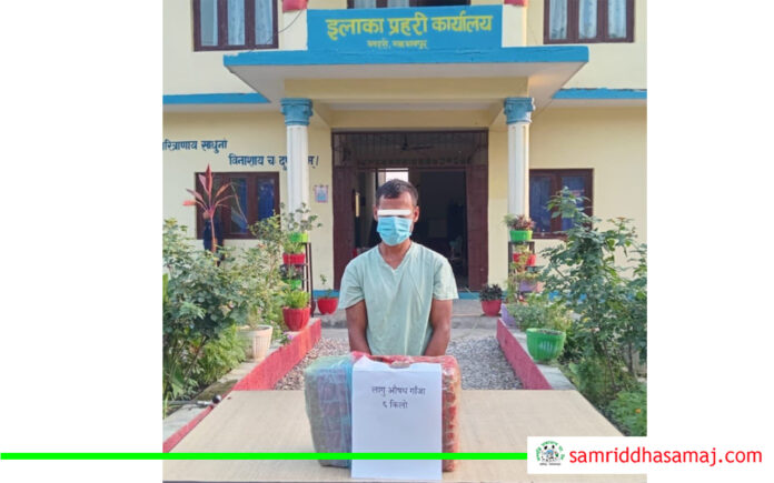 गाँजासहित पक्राउ परेका दीपक थापालाई सार्वजनिक गर्दै प्रहरी ।
