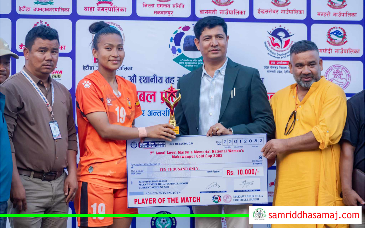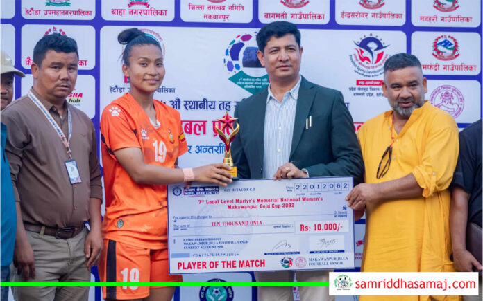 प्लेयर अफ द म्याच रश्मि कुमारी घिसिङलाई पुरस्कृत गरिँदै ।
