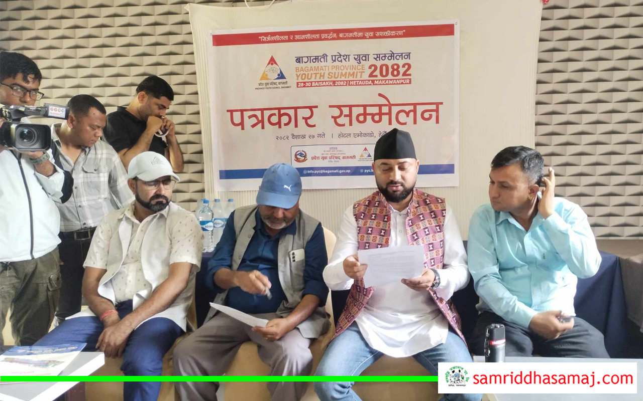 हेटौँडा : बागमती प्रदेश युवा परिषद्को आयोजनामा आइतबारबाट प्रदेश युवा सम्मेलन आयोजना हुने भएको छ । तेस्रो संस्करणको सम्मेलनमा ३ सय भन्दा बढी युवाको सहभागिता रहने बताइएको छ । शनिबार बिहान पत्रकार सम्मेलन गरेर प्रदेश युवा परिषद्का कार्यकारी उपाध्यक्ष सन्तोष चौलागाईले युवालाई नवप्रवर्तन र उद्यमशीलताको क्षेत्रमा प्रोत्साहित गर्ने उद्देश्य रहेको जानकारी गराउनुभयो ।