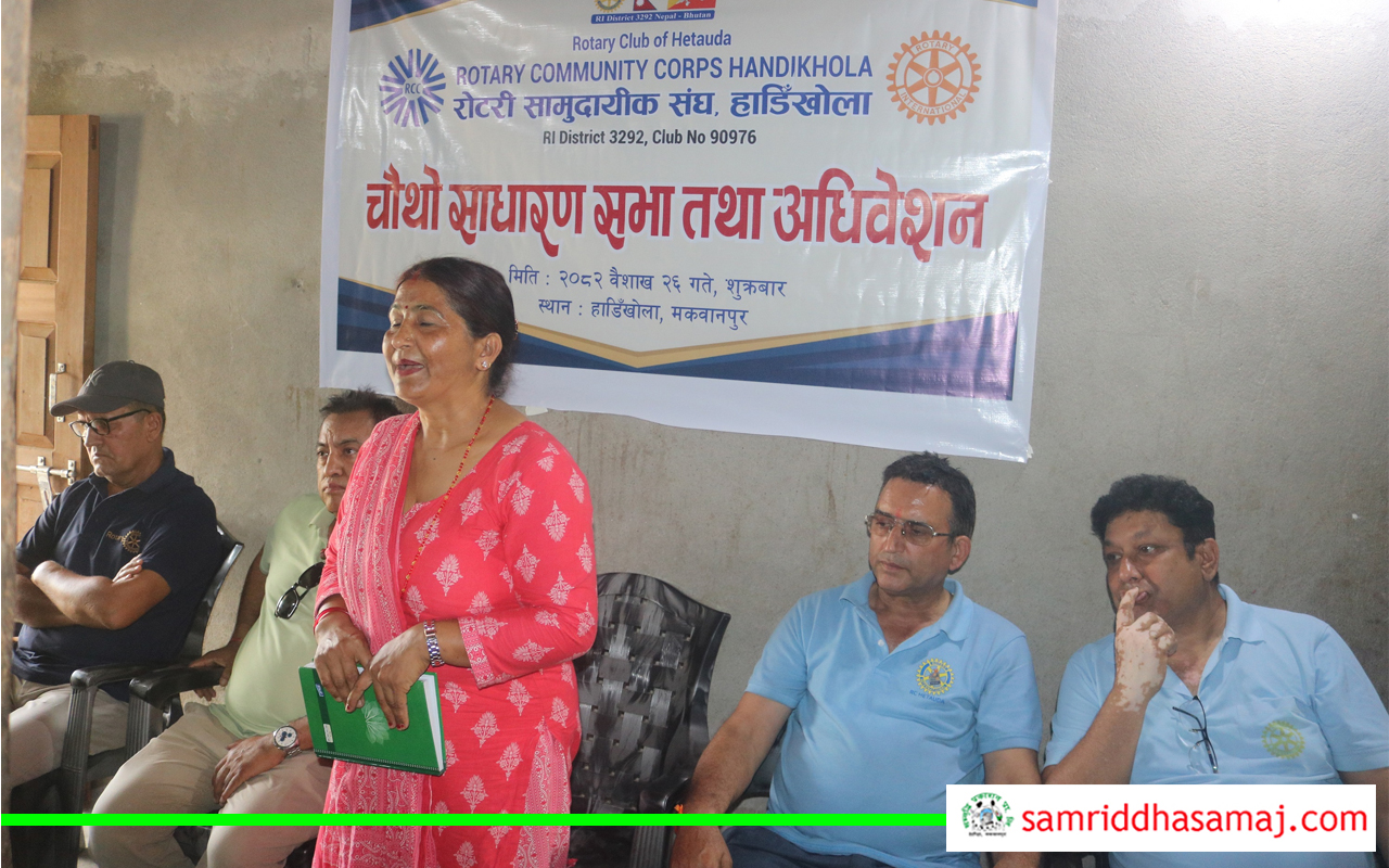 हेटौँडा : रोटरी क्लब अफ हेटौँडा अन्तर्गतको रोटरी सामुदायिक संघ हाँडीखोलाको चौथो साधारणसभा तथा अधिवेशन सम्पन्न भएको छ । शुक्रबार सम्पन्न अधिवेशनले पुनः अम्बिका पौडेलको अध्यक्षतामा ११ सदस्यीय नयाँ कार्यसमिति चयन गरेको छ । समितिको उपाध्यक्षमा बबिता लुईटेल, सचिवमा सुनिता पण्डित, कोषाध्यक्षमा सरिता सुवेदी, सदस्यहरुमा लक्ष्मी थापा, सानु सुनार, सुशीला बर्तौला, मिठु कार्की, पार्वती प्रजा, सुनमाया बल र शान्तादेवी बर्तौला रहेका छन् ।