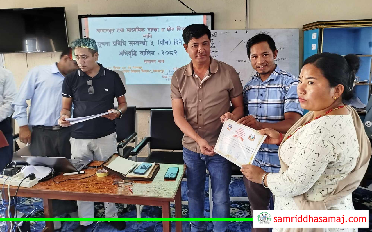 हेटौँडा : मकवानपुरको कैलाश गाउँपालिकाका आधारभूत तथा माध्यामिक तहका आइटि स्रोत शिक्षकहरुलाई सूचना प्रविधि सम्बन्धी तालिम प्रदान गरिएको छ । शुक्रबारदेखि सञ्चालित तालिम मंगलबार समापन भएको हो ।