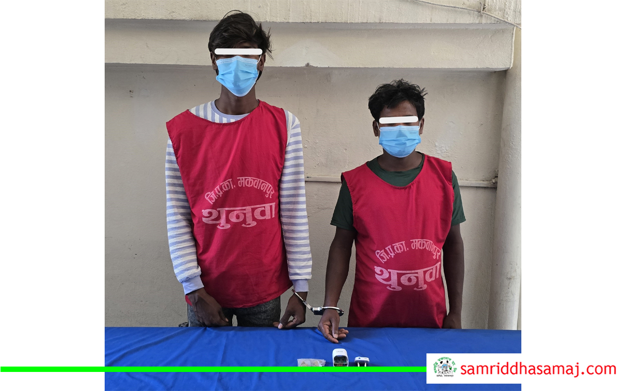 हेटौँडा : लागूऔषध खैरो हेरोइनसहित मकवानपुर प्रहरीले बुधबार २ जनालाई पक्राउ गरेको छ । बुधबार दिउँसो ३ बजेको समयमा प्रहरी टोलीले हेटौँडा–१५, रातोमाटेमा सुरक्षाजाँच गर्ने क्रममा पर्सा जिल्लाको बीरगन्ज महानगरपालिका–५ का २० वर्षीय करण राय र २९ वर्षीय उपेन्द्र रायभरलाई लागूऔषध खैरो हेरोइन १८ ग्राम १५० मिलिग्रामसहित पक्राउ गरेको जिल्ला प्रहरी कार्यालय मकवानपुरले जनाएको छ ।