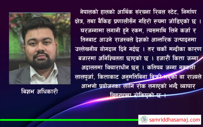 नेपालको हालको आर्थिक संरचना रियल स्टेट, निर्माण क्षेत्र, तथा बैंकिङ प्रणालीसँग गहिरो रूपमा जोडिएको छ । घरजग्गामा लगानी हुने रकम, त्यसमाथि लिने कर्जा र तिनबाट आउने राजस्वले देशको आन्तरिक उत्पादनमा उल्लेखनीय योगदान दिने गर्दछ । तर चर्को मन्दीका कारण बजारमा अनिश्चितता छाएको छ । हजारौं कित्ता जग्गा अदालतमा विचाराधीन छन् । कतिपय जग्गा नक्कली लालपुर्जा, कित्ताकाट अनुमतिबिना बिक्री भएको वा राज्यले आफ्नो प्रयोजनका लागि रोक लगाएको भन्दै व्यापार वितरणमा रोकिएको छ । यसले गर्दा जग्गा मालिकहरू आफ्नो सम्पत्ति प्रयोग गर्न सक्दैनन्, खरीदारहरू द्विविधामा छन् र विकास÷निर्माणका कार्यहरू ठप्प छन् । यस्तो स्थितिले समग्र आर्थिक चक्रमा प्रतिकूल प्रभाव पार्छ ।
