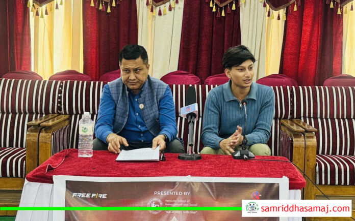 इ–स्पोर्ट्स प्रतियोगिता आयोजनाबारे जानकारी गराउँदै नेशनल गोल्ड टेलिभिजनका अध्यक्ष उज्जवल चौलागाई (बायाँ) र संयोजक उत्सर्ग चौलागाई (दायाँ)।