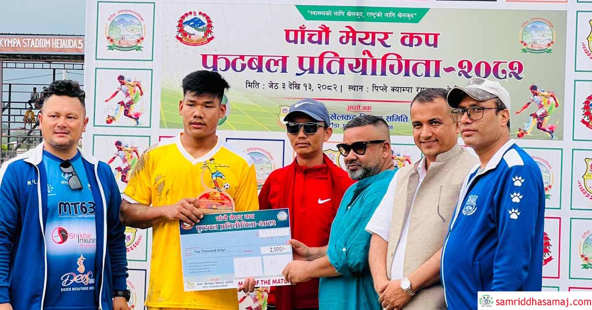दोस्रो खेलको म्यान अफ त म्याच हेटौँडा–१७ का समीरराज थोकर घोषित भए । मेयर कप फुटबल प्रतियोगितामा हेटौँडा उपमहानगरका १९ वटै वडाको सहभागिता रहेको छ । प्रतियोगिताअन्तर्गत शुक्रबार पहिलो खेल हेटौँडा–२ र हेटौँडा–७ बीच हुनेछ भने दोस्रो खेल हेटौँडा–८ र हेटौँडा–९ बीच हुने आयोजकले जनाएको छ ।