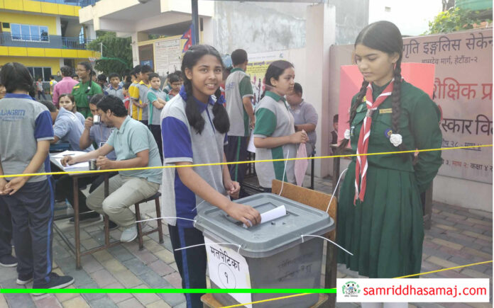 विद्यालयले कक्षा–६ देखि १० सम्मका ६ सय ७० जना विद्यार्थीले मतदान गर्ने व्यवस्था गरिएको जनाएको छ । बिहान साढे ७ बजेबाट सुरु भएको मतदान कार्यक्रम बिहान ११ बजे सम्पन्न भएर मतगणनाको कार्य भइरहेको छ । विद्यालय कप्तानमा कक्षा–९ का दीक्षान्त लामा र आकांक्षा लामा उम्मेद्वार छन् । विद्यालय शिक्षकहरुले निर्वाचन अधिकृतको भूमिका निर्वाह गरेका छन् भने स्वयम्सेवकको रुपमा स्काउटका विद्यार्थी सहभागी छन् । कक्षा–६ देखि कक्षा–९ सम्मका विद्यार्थी उम्मेदवार हुन पाउने व्यवस्था गरिएको विद्यालयका प्रिन्सीपल विनोद सुवेदीले जानकारी दिनुभयो । १८ पदका लागि ५० जना विद्यार्थीको उम्मेदवारी रहेको छ ।
