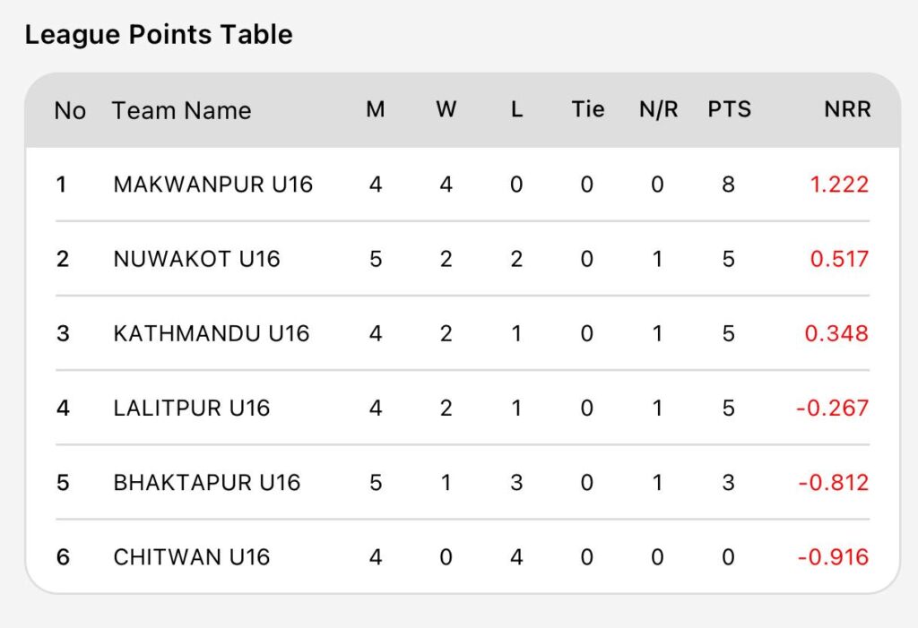 हारका बाबजुद नुवाकोट ५ अंकसहित तालिकाको दोस्रो स्थानमा छ । काठमाडौं पनि ५ अंकसहित तेस्रो स्थानमा छ । ललितपुर ५ अंकसहित चौथो स्थानमा रहँदा भक्तपुर ३ अंकसहित पाँचौँ र अंकविहिन चितवन तालिकाको पुछारमा छ । मकवानपुरले अन्तिम खेल भोलि मंगलबार चितवनसँग खेल्नेछ । प्रदेशस्तरीय छनोट खेलपछि बागमती प्रदेश क्रिकेट संघले यु–१६ प्रदेश टिम तयार पारेर यही जेठ १७ गतेदेखि सुर्खेतमा हुने ७ वटै प्रदेशका टिमबीच हुने प्रतियोगितामा सहभागिता जनाउनेछ ।