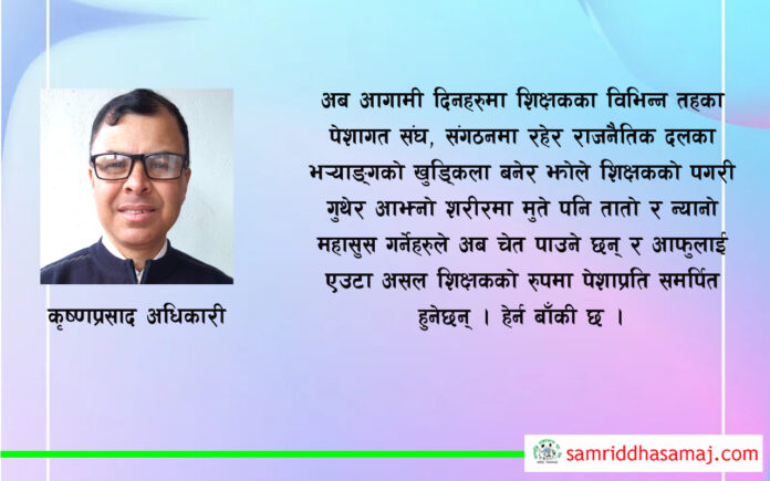 अब आगामी दिनहरुमा शिक्षकका विभिन्न तहका पेशागत संघ, संगठनमा रहेर; राजनैतिक दलका भर्याङ्गको खुड्किला बनेर झोले शिक्षकको पगरी गुथेर आफ्नो शरीरमा मुते पनि तातो र न्यानो महासुस गर्नेहरुले अब चेत पाउने छन् र आफुलाई एउटा असल शिक्षकको रुपमा पेशाप्रति समर्पित हुनेछन् । हेर्न बाँकी छ । हाल उपसमितिमा जुटेको भनिएको सहमति अनुसारनै शिक्षा विधेयक पारित भएमा शिक्षक महासंघमा नेतृत्वमा बस्ने शिक्षक नेताहरु कुन मुख लिएर शिक्षक माझ आउलान् ? राजनैतिक दलहरु जति धेरै भए पनि शिक्षा ऐनमा समेट्नु पर्ने विषयमा एक हुन् सक्ने तर विभिन्न पेशागत (दलगत) संगठन मा रहेका एउटै पेशाका शिक्षकहरु आफ्ना माग मुद्दामा एक भएर जुट्न नसक्ने कस्तो बिडम्बना ! सरकारले फुटाउ र शासन गर भन्ने रणनीति लागु गरेर आफूलाई शिक्षक विरोधीको रुपमा प्रस्तुत ग¥यो । त्यसबाट शिक्षकहरुले बुझेर देशभरका शिक्षकरुको बीचमा विश्वासको वातावरण बनाई एक हुन प्रयास थालिहाल्नु पर्छ ।