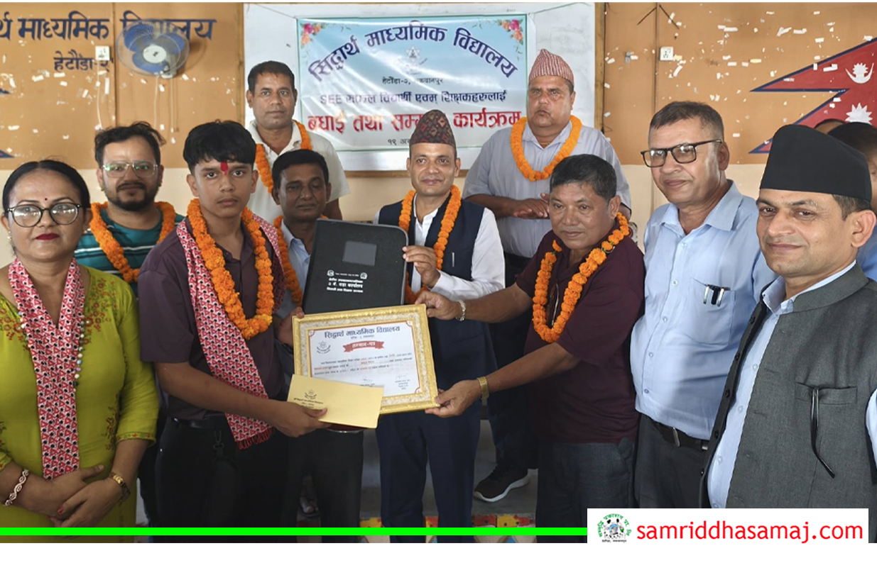 हेटौँडा : हेटौैँडा–२ स्थित सिद्धार्थ माविबाट २०८१ सालको एसईईमा उत्तीर्ण भएका विद्यार्थीलाई विद्यालय र २ नम्बर वडा कार्यालयले पुरस्कृत तथा सम्मान गरेको छ । बिहीबार विद्यालयमा एक कार्यक्रमको आयोजना गर्दै संयुक्त रुपमा वडा कार्यालय र विद्यालयले विद्यार्थीलाई पुरस्कृत गरेको विद्यालयलका प्रध्यानाध्यापक परमानन्द सरोज कर्णले बताउनुभयो ।