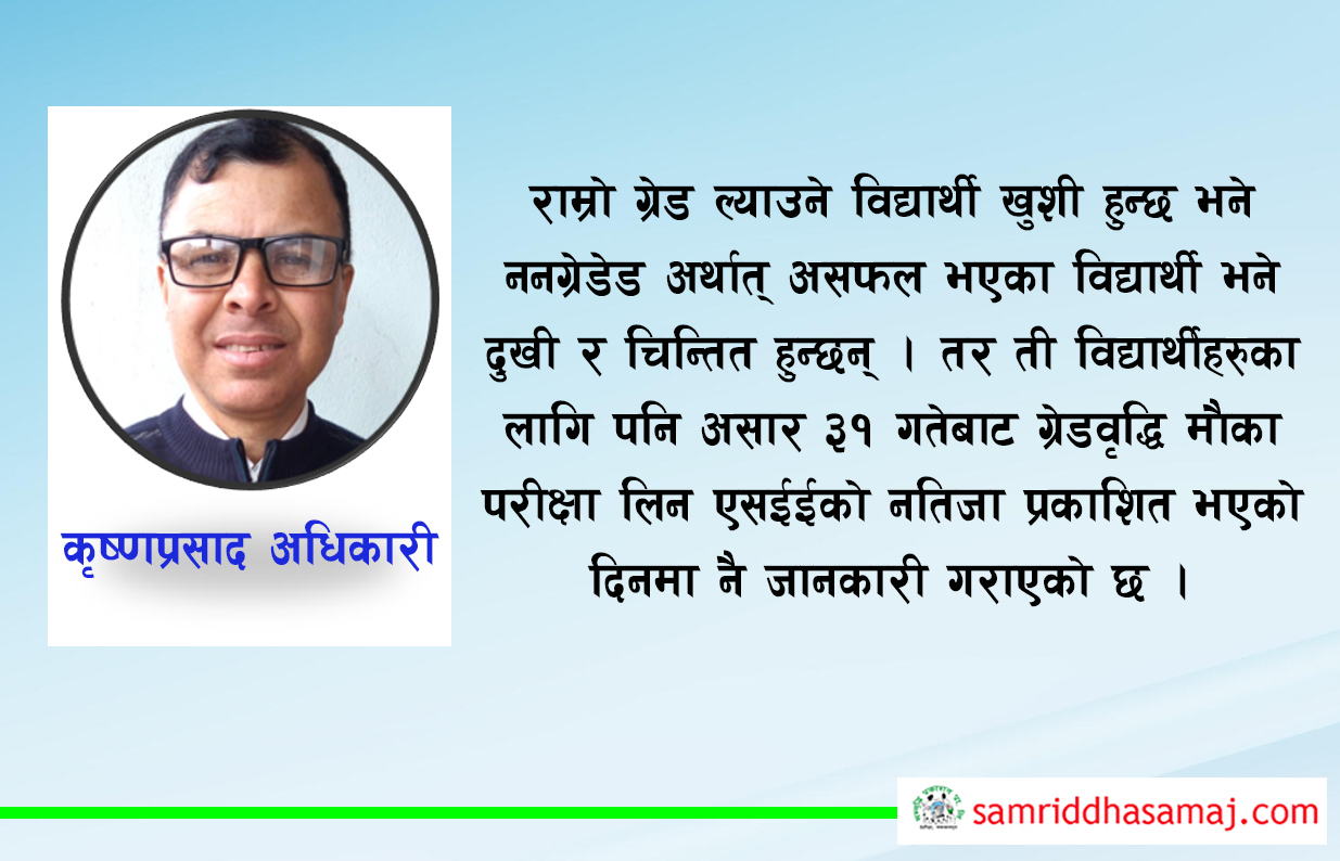 जसरी एउटा किसानले आफुले लगाएको बाली भित्र्याउने बेलामा खुशी हुन्छ त्यसैगरी विद्यार्थीहरुले १० वर्षभर अध्ययन गरेर एक खुड्किलो चढ्दै दशौं खुड्किलो उक्लेर आफ्नो नयाँ गोरेटो कोर्न पाउँदा खुशी हुनु स्वभाविक हो । तर राम्रो ग्रेड ल्याउने विद्यार्थी खुशी हुन्छ भने ननग्रेडेड अर्थात् असफल भएका विद्यार्थी भने दुखी र चिन्तित हुन्छन् । तर ती विद्यार्थीहरुका लागि पनि असार ३१ गतेबाट ग्रेडवृद्धि मौका परीक्षा लिन एसईईको नतिजा प्रकाशित भएको दिनमा नै जानकारी गराएको छ । त्यसैले ती विद्यार्थीहरु हत्तोत्साही हुनुपर्दैन । एकपटक असफल हुँदैमा हरेश खानु हुँदैन । लगातारको प्रयासपछि अवश्य सफलता पाउन सकिन्छ ।