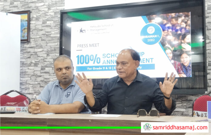 हेटौँडा स्कूल अफ म्यानेजमेन्ट नाफामुखी संस्था भए पनि कक्षा–११ मा शिक्षाशास्त्र संकायमा प्रोत्साहनसहितको पूर्ण छात्रवृत्ति कार्यक्रम सामाजिक उत्तरदायित्वबाट समेत प्रेरित भएर सञ्चालन गर्न खोजिएको प्रिन्सीपल जोशीले बताउनुभयो । हेटौँडा स्कूल अफ म्यानेजमेन्टले हेटौँडा–४ स्थित नवोदय शिशु सदन र नवोदय इनोभेसन सेन्टरसँगको सहकार्यमा कक्षा–११ मा शिक्षाशास्त्र संकायमा पठनपाठन सुरु गर्न लागेको हो ।