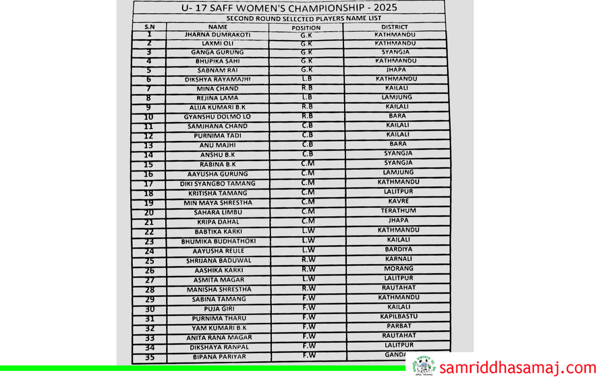 हेटौँडा : भुटानमा आयोजना हुने साफ यू–१७ महिला च्याम्पियनसिपका लागि नेपाली टिमका ३५ खेलाडीको नामावली सार्वजनिक गरिएको छ । मंगलबार साँझ अखिल नेपाल फुटबल संघ (एन्फा)ले हेटौंडाको गौरिटार रंगशालामा संचालन गरेको छनौट क्याम्पबाट ३५ खेलाडीको नामावली सार्वजनिक गरेको हो ।