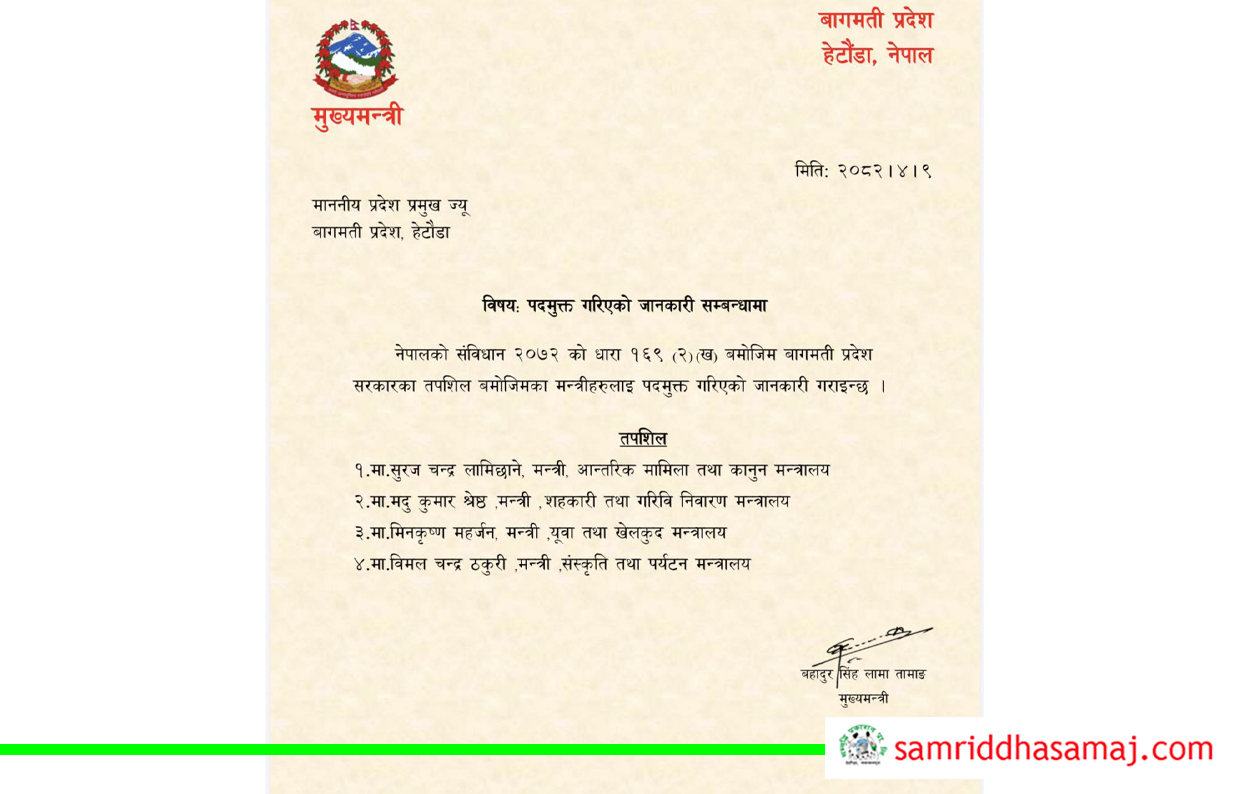 हेटौँडा : बागमती प्रदेश सरकारबाट राजिनामा दिएका ४ जना मन्त्री पदमुक्त भएको मुख्यमन्त्री बहादुर सिंह लामाले सूचित गर्नुभएको छ । शुक्रबार दिउँसो ह्वाट्सयापमार्फत राजिनामा बुझाएका ४ मन्त्री पदमुक्त भएको मुख्यमन्त्री लामाले शुक्रबार साँझ प्रदेश प्रमुखलाई जानकारी गराउनुभएको छ ।