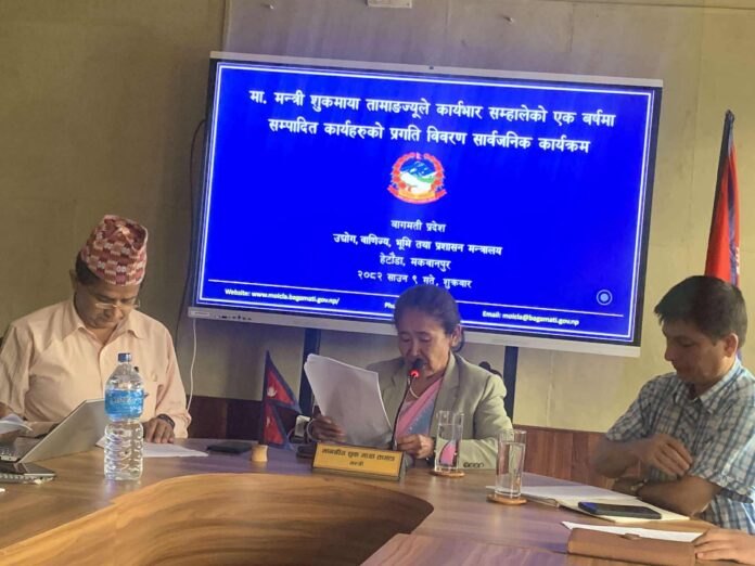हेटौंडा : बागमती प्रदेशको उद्योग, वाणिज्य, भूमि तथा प्रशासन मन्त्री सुकमाया तामाङले आफ्नो एकवर्षे कार्यकालको प्रगति विवरण तथा सम्पादन भएका योजना सार्वजनिक गर्नुभएको छ । शुक्रबार पत्रकार भेटघाटमार्फत् मन्त्री तामाङले एक वर्षको अवधिमा मन्त्रालयले गरेका कामहरुको विवरण सार्वजनिक गर्नुभएको हो ।