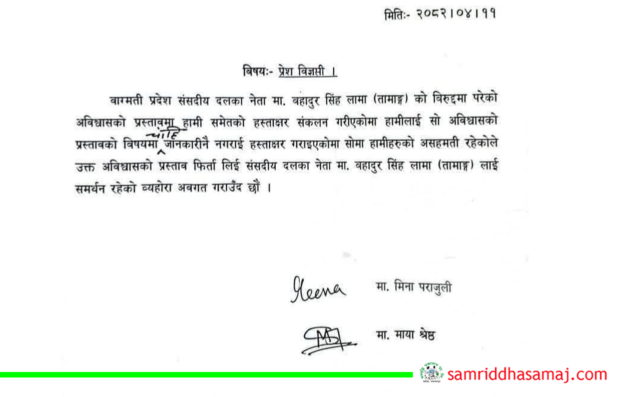 उनीहरुले एक विज्ञप्ती जारी गर्दै आफ्नो हस्ताक्षर फिर्ता गरेको र मुख्यमन्त्री लामालाई नै समर्थन रहेको जनाएका हुन् । गत शुक्रबार मुख्यमन्त्री लामा विरुद्ध दर्ता भएको अविश्वास प्रस्तावमा श्रेष्ठ र पराजुलीसहित २१ जना प्रदेशसभा सदस्यले हस्ताक्षर गरेका थिए । दुई सदस्यको हस्ताक्षर फिर्ता भएसँगै सभापति बानियाँको पक्षमा १९ जनाको हस्ताक्षर कायम रहेको छ ।