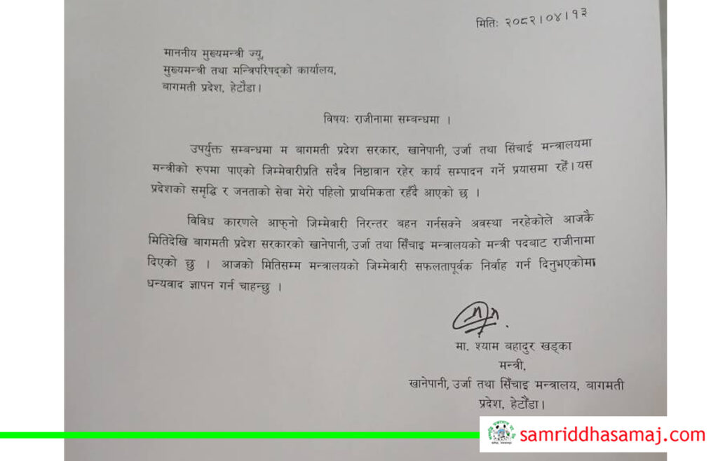 हेटौँडा : कांग्रेस बागमती प्रदेश संसदीय दलको नेताबाट मुख्यमन्त्री बहादुर सिंह लामालाई हटाउने सन्दर्भमा भइरहेको उतारचढावमा अर्का एक मन्त्रीले राजिनामा दिएका छन् । खानेपानी, उर्जा तथा सिंचाई मन्त्री श्याम खड्काले मंगलबार बिहान मुख्यमन्त्री लामा समक्ष राजिनामा बुझाउनु भएको हो । यसअघि ४ जना मन्त्रीले संयुक्त राजिनामा बुझाएका थिए । मुख्मयन्त्री लामाविरुद्धको अविश्वासको प्रस्तावको सन्दर्भमा अहिले संसदीय दलको बैठक बस्दैछ ।