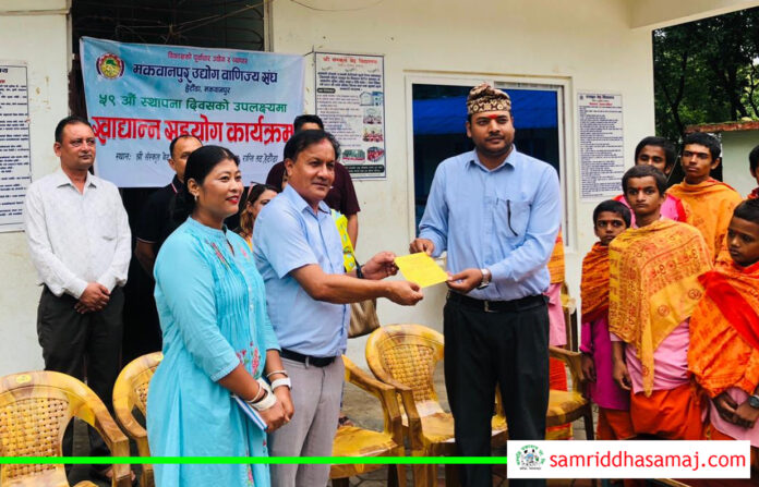 हेटौँडा : मकवानपुर उद्योग वाणिज्य संघको ५९औं स्थापना दिवसको अवसरमा हेटौँडाका दुई संस्कृत विद्यालयमा खाद्यान्न वितरण गरिएको छ । संघले हेटौँडा–१०, राप्तीतट गोरक्षश्वरधाममा रहेको संस्कृत वेद विद्यालय र हेटौँडा–१८, हर्नामाडीस्थित वैदिक संस्कृत गुरुकुलम्लाई खाद्यान्न सहयोग गरेको हो । आइतबार दुवै विद्यालयमा पुगेर खाद्यान्न हस्तान्तरण गरिएको हो ।