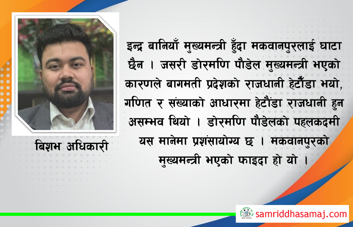 इन्द्र बानियाँ मुख्यमन्त्री हुँदा मकवानपुरलाई घाटा छैन । जसरी डोरमणि पौडेल मुख्यमन्त्री भएको कारणले बागमती प्रदेशको राजधानी हेटौँडा भयो, गणित र संख्याको आधारमा हेटौंडा राजधानी हुन असम्भव थियो । डोरमणि पौडेलको पहलकदमी यस मानेमा प्रशंसायोग्य छ । मकवानपुरको मुख्यमन्त्री भएको फाइदा हो यो । त्यस्तै, अब इन्द्र बानियाँ मुख्यमन्त्री भए यिन्ले राजधानी अनुकूलको पूर्वाधार निर्माणमा जोड दिने छन् भन्ने विश्वास गर्न सकिन्छ । प्रदेशको विकासमा तिव्रता र सम्भावना देखिन सक्छ । बागमती प्रदेश सबैभन्दा स्रोत सम्पन्न र आर्थिकरूपमा महत्वपूर्ण प्रदेश हो । यस्तो प्रदेशमा मुख्यमन्त्रीको नेतृत्वमा विकासको रोडम्याप, नवप्रवर्तन र संस्थागत सुधार देखिनु पर्ने हो ।