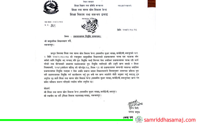 हेटौँडा : शिक्षा विकास तथा समन्वय इकाई मकवानपुरले नियमानुसार प्रधानाध्यापक नियुक्त गर्न, गराउन सबै विद्यालयहरुलाई ध्यानाकर्षण गराएको छ । शिक्षा तथा मानव स्रोत विकास केन्द्रको शासकीय सुधार शाखाको परिपत्रअनुसार इकाईले मकवानपुरका सबै विद्यालयलाई सम्बोधन गरेर सूचना जारी गरेको हो ।