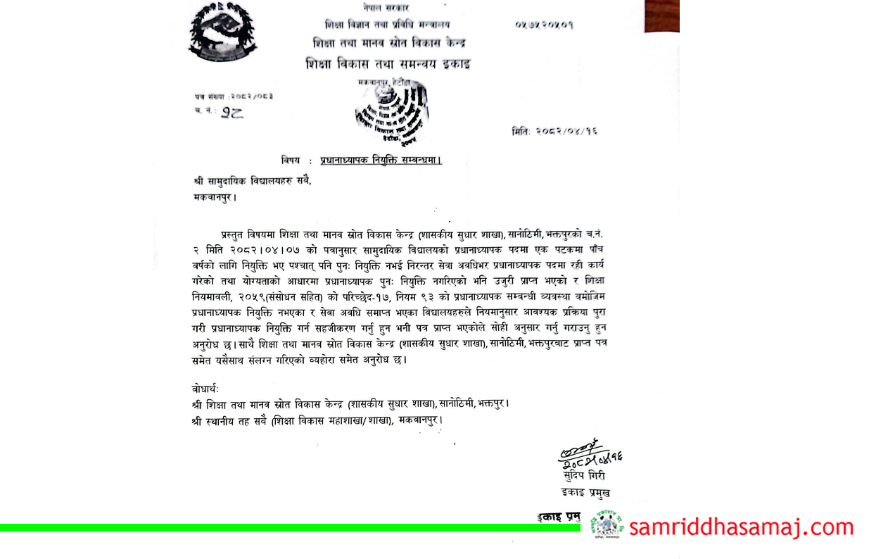 हेटौँडा : शिक्षा विकास तथा समन्वय इकाई मकवानपुरले नियमानुसार प्रधानाध्यापक नियुक्त गर्न, गराउन सबै विद्यालयहरुलाई ध्यानाकर्षण गराएको छ । शिक्षा तथा मानव स्रोत विकास केन्द्रको शासकीय सुधार शाखाको परिपत्रअनुसार इकाईले मकवानपुरका सबै विद्यालयलाई सम्बोधन गरेर सूचना जारी गरेको हो ।