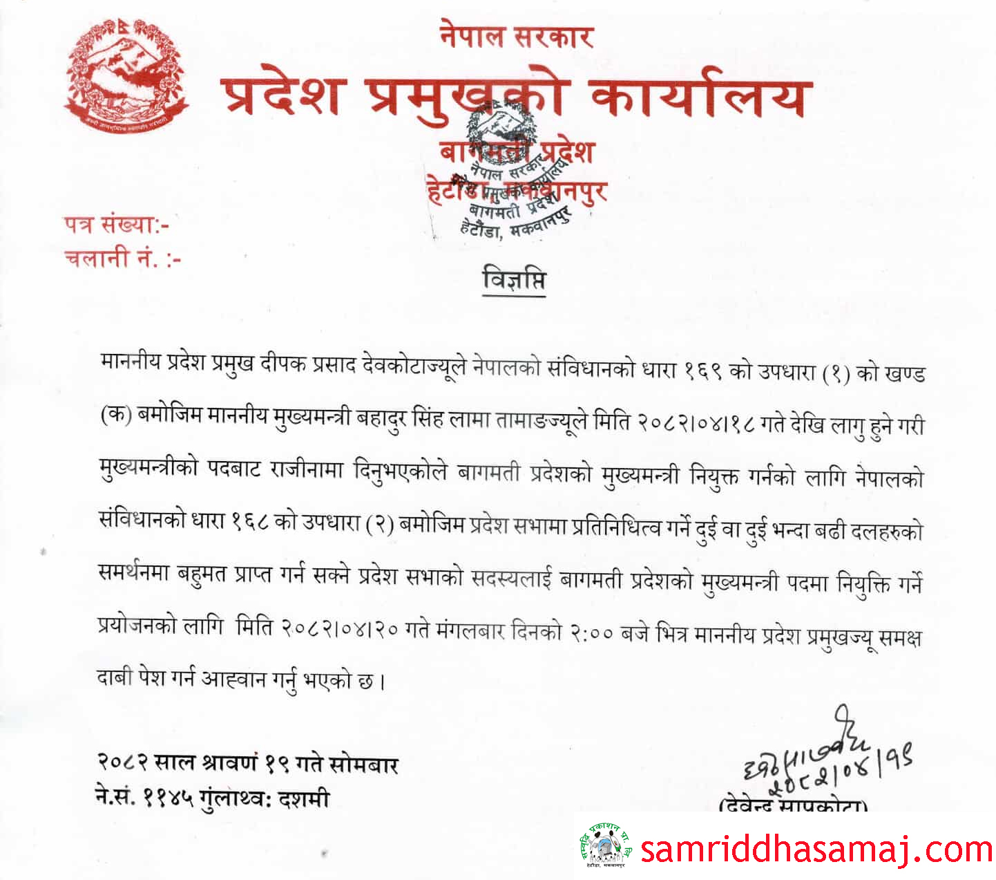 हेटौँडा : बागमती प्रदेशका मुख्यमन्त्री बहादुर सिंह लामाले पदबाट राजीनामा दिएपछि प्रदेशमा नयाँ मुख्यमन्त्री नियुक्तिको प्रक्रिया औपचारिक रूपमा सुरु भएको छ । प्रदेश प्रमुख दीपक प्रसाद देवकोटाले नेपालको संविधानको धारा १६८ को उपधारा (२) बमोजिम दावी पेश गर्न आह्वान गरिएको हो ।