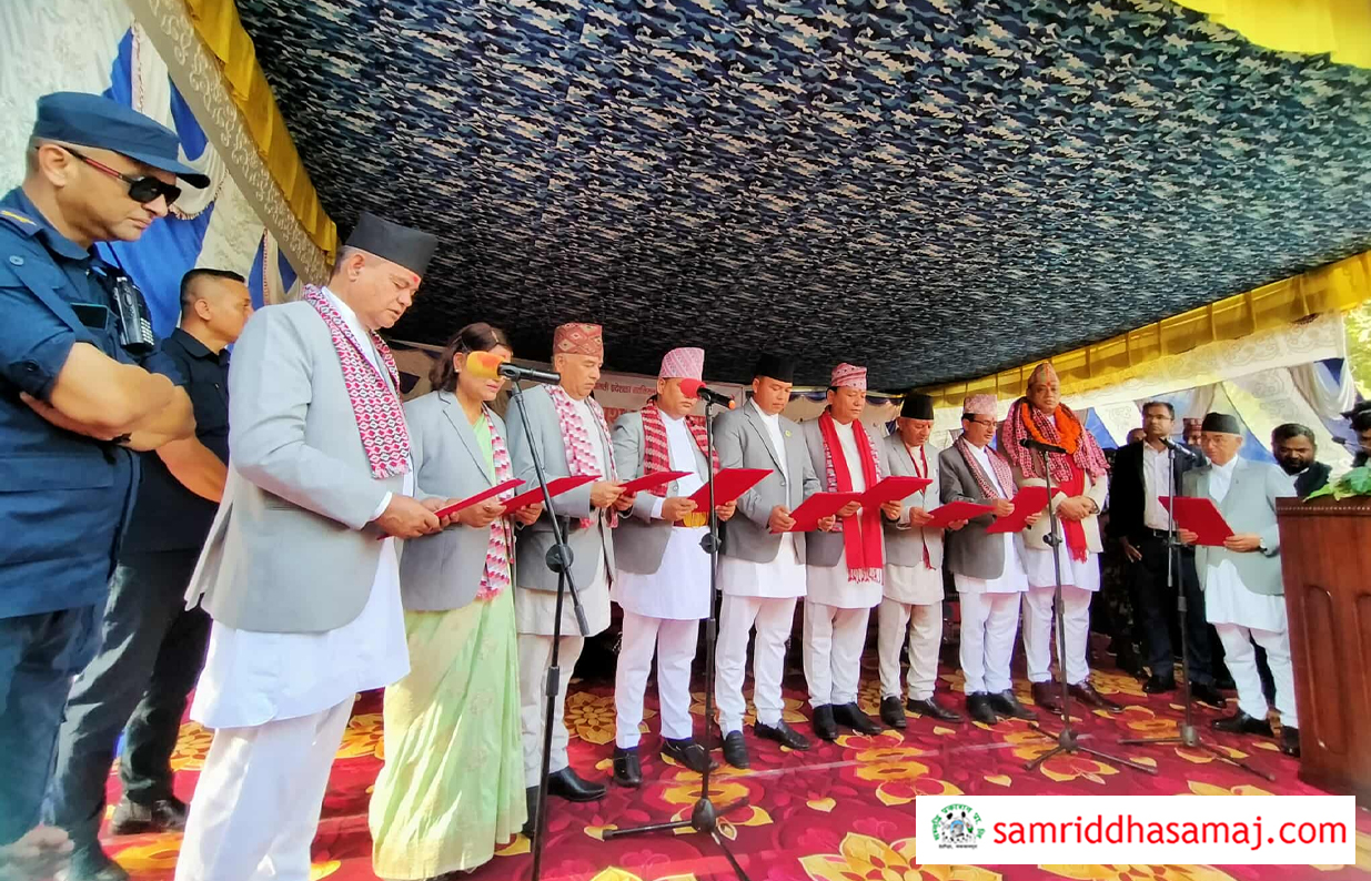 कांग्रेसका २ र एमालेका ६ मन्त्रीले पद तथा गोपनियताको सपथ ग्रहण गरेका हुन् । मुख्यमन्त्री बानियाँले एमालेबाट मधुसुदन पौडेललाई कृषि तथा पशुपंछी विकास मन्त्री, डा. दिनेशचन्द्र देवकोटालाई भौतिक पूर्वाधार विकासमन्त्री, जयराम थापालाई श्रम रोजगार तथा यातायात मन्त्री, भरतबहादुर केसीलाई वन तथा वातावरणमन्त्री, किरण थापालाई स्वास्थ्य मन्त्री र बिन्दु श्रेष्ठलाई उद्योग वाणिज्य भूमि तथा प्रशासन मन्त्री नियुक्त गर्नुभएको थियो ।