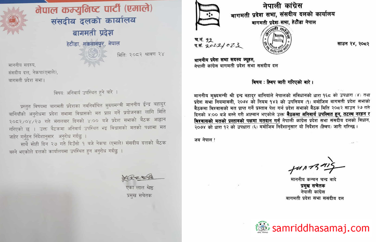 यसअघि मुख्यमन्त्री बानियाँलाई विश्वासको मत दिन नेपाली कांग्रेसले प्रदेशसभा सदस्यहरूलाई ह्वीप जारी गरेको थियो । शनिबार कांग्रेस बागमती प्रदेश संसदीय दलका सदस्य सचिव मीनकृष्ण महर्जनले एक सूचना सम्प्रेषण गर्दै मुख्यमन्त्री बानियाँको विश्वासको मत सम्बन्धी प्रस्ताव माथिको छलफलमा अनिवार्य उपस्थित हुन निर्देशन दिनुभएको छ ।