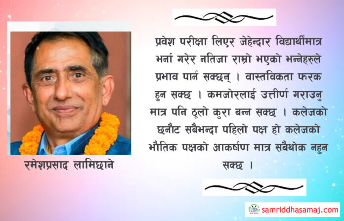 कुनै पनि विषयमा हासिल गरिने विज्ञता र विशेषज्ञता नै महत्वपूर्ण मानिएको छ । प्रवेश परीक्षा लिएर जेहेन्दार विद्यार्थीमात्र भर्ना गरेर नतिजा राम्रो भएको भन्नेहरुले प्रभाव पार्न सक्छन् । वास्तविकता फरक हुन सक्छ । कमजोरलाई उत्तीर्ण मात्र पनि ठूलो कुरा बन्न सक्छ । कलेजको छनौट सबैभन्दा पहिलो पक्ष हो कलेजको भौतिक पक्षको आकर्षण मात्र सबैथोक नहुन सक्छ । अध्ययन अध्यापनमा संलग्न प्राध्यापकहरुको योग्यता, स्तर, क्षमता, शैली, व्यवहार, चरित्र आदिले अधिक प्रभाव पार्ने भएकाले कक्षाकोठाको शैक्षणिक वातावरण समेतको ज्ञान हुन जरुरी छ । शिक्षणमा प्रविधिको प्रयोग र प्रयोगात्मक कक्षाहरुको प्रभावकारिताका सवालमा समेत आवश्यक जानकारी लिन नबिर्सनु होला । प्रयोगात्मक अभ्यासहरुको प्रभावकारिताबाट तपाईंको सीप सिकाईमा व्यापक प्रभाव पारिरहने तथ्यलाई गम्भिरतापूर्वक विचार गर्न पनि म आग्रह गर्दछु ।