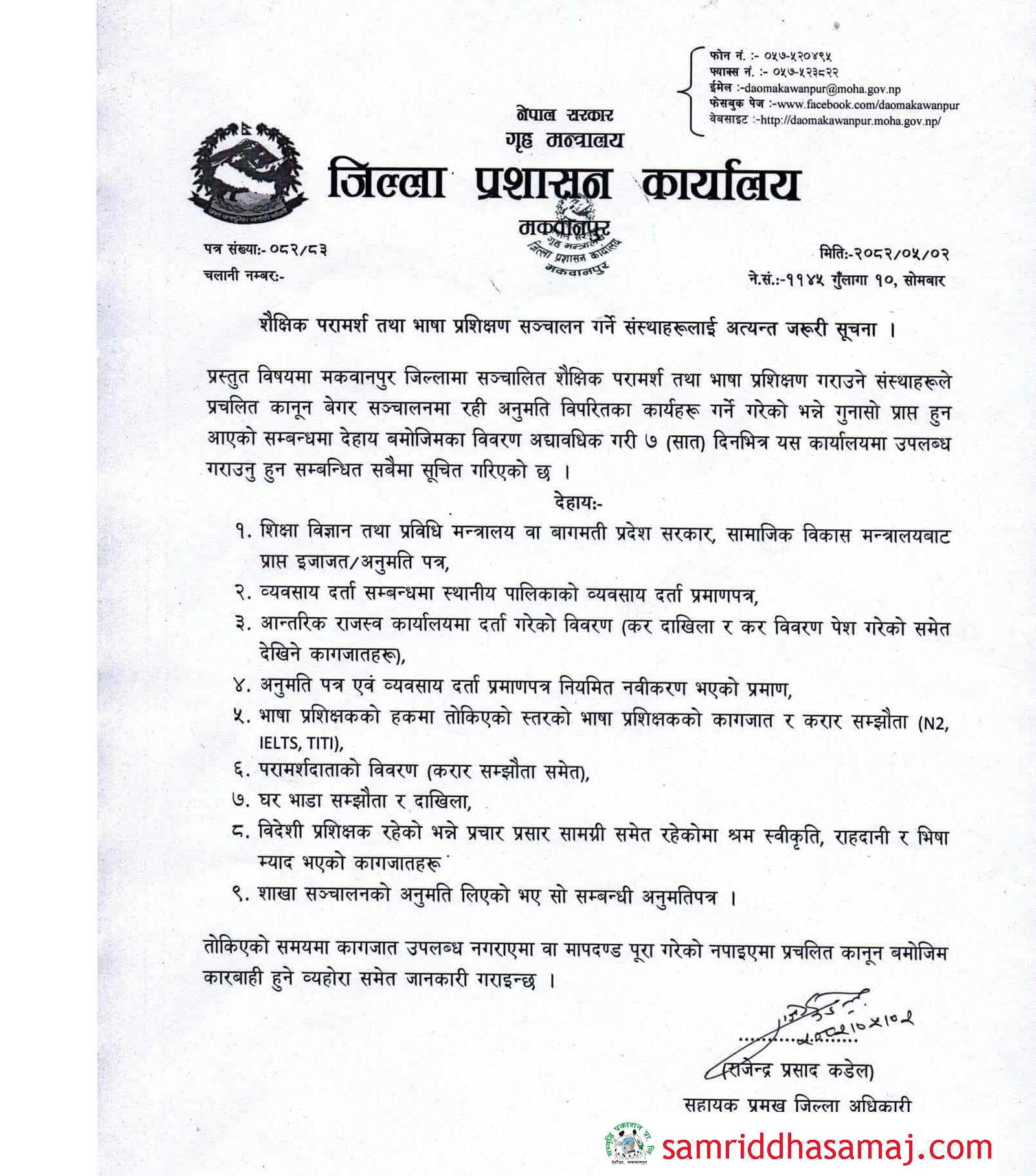 हेटौँडा : जिल्ला प्रशासन कार्यालय मकवानपुरले जिल्लाभित्र सञ्चालित शैक्षिक परामर्श तथा भाषा प्रशिक्षण संस्थाहरुलाई ७ दिनभित्र आवश्यक कागजात अद्यावधिक गरी पेश गर्न निर्देशन दिएको छ ।