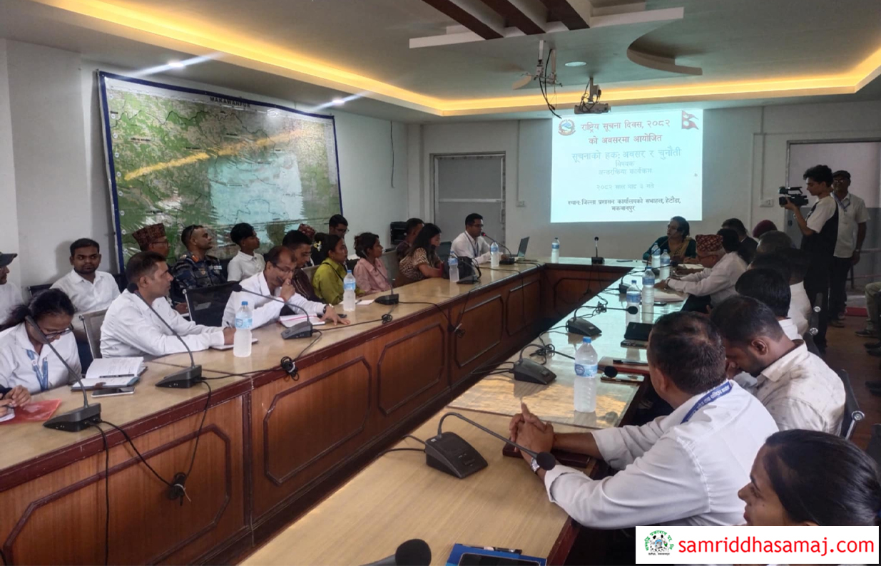 ‘सूचनाको हक ः अवसर र चुनौति’ शीर्षकमा सहायक प्रमुख जिल्ला अधिकारी राजेन्द्र प्रसाद कँडेलले कार्यपत्र प्रस्तुत गर्नुभएको थियो । सहायक प्रजिअ कँडेलले सूचनाको हक सम्बन्धमा भएको व्यवस्था, सूचनाको हकको कार्यान्वयनबाट हुने लाभ र कार्यान्वयनका चुनौतिका विषयमा प्रस्तुती राख्नुभएको थियो । कार्यपत्र प्रस्तुतीपछि कार्यालय प्रमुख तथा सूचना अधिकारी सँगै सञ्चारकर्मीले छलफलमा भाग लिएका थिए । कार्यालय प्रमुख तथा सूचना अधिकारीहरुले सूचना माग गर्दै गर्दा सूचना माग्ने व्यक्तिले दुख दिने नियत मात्रै राख्ने गरेको उल्लेख गर्नुभयो । यस्तै सञ्चारकर्मीले सूचनाको हकले माग्नेलाई सूचना दिने मात्रै नभई सार्वजनिक सरोकारका सूचनालाई कार्यालयले नै सार्वजनिक गर्नुपर्नेमा जोड दिएका थिए ।