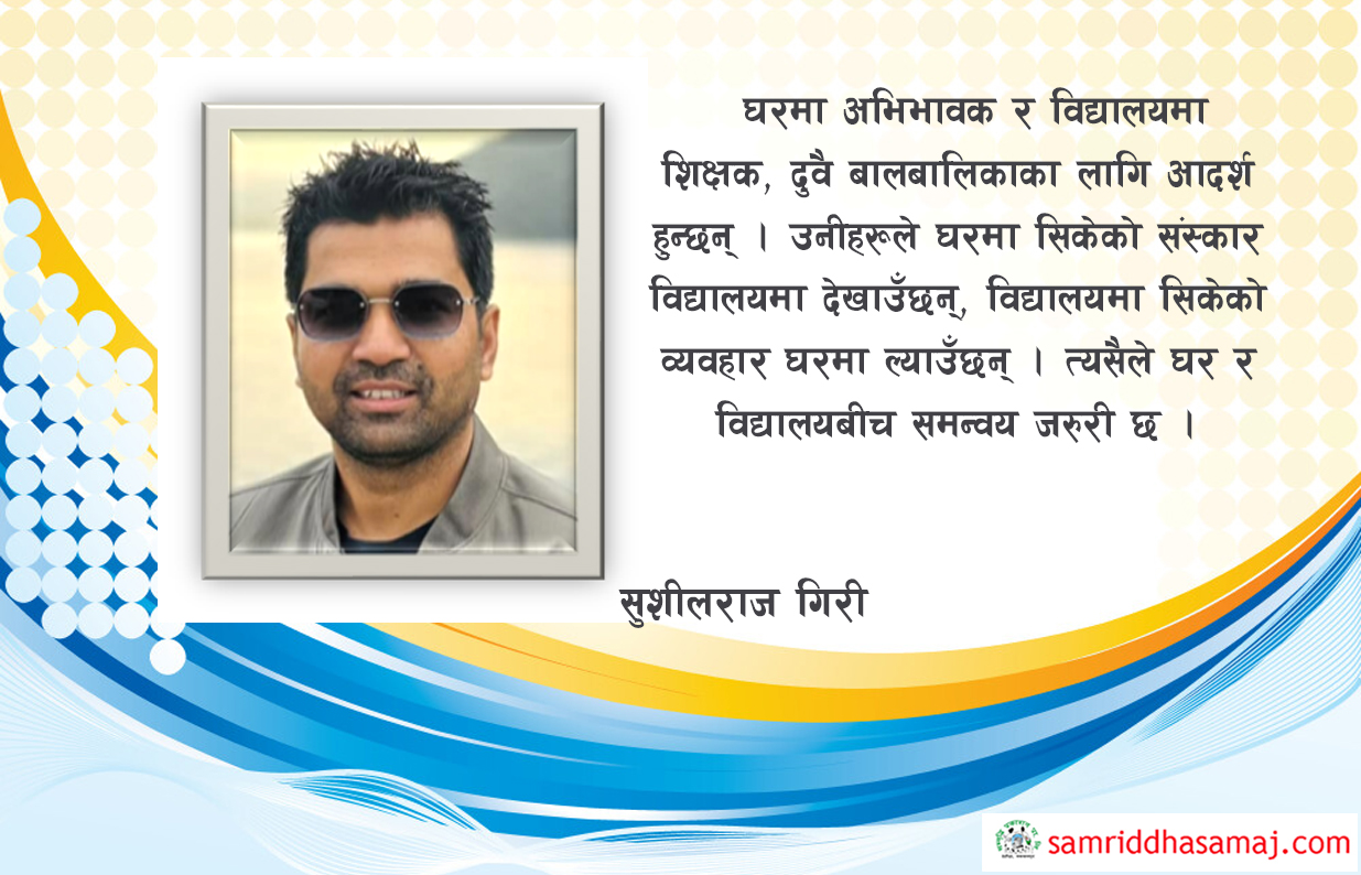 घरमा अभिभावक र विद्यालयमा शिक्षक, दुवै बालबालिकाका लागि आदर्श हुन्छन् । उनीहरूले घरमा सिकेको संस्कार विद्यालयमा देखाउँछन्, विद्यालयमा सिकेको व्यवहार घरमा ल्याउँछन् । त्यसैले घर र विद्यालयबीच समन्वय जरुरी छ । घरमा बच्चालाई प्रश्न सोध्न प्रोत्साहित गरौं, विद्यालयमा उनीहरूको जिज्ञासा सुन्न उत्साहित गरौं । घरमा तुलना नगरी आफ्नै क्षमतामा हौसला दिऔं, विद्यालयमा पनि अंकको आधारमा मात्र होइन, प्रयासको आधारमा प्रशंसा गरौं ।