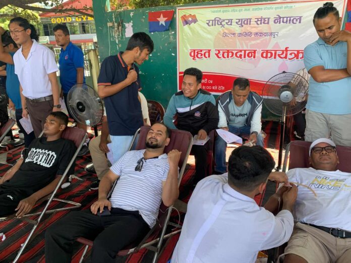 हेटौँडा : नेकपा एमालेको भातृ संगठन युवा संघ मकवानपुरको आयोजनामा हेटौँडाको हुप्रचौरमा भएको रक्तदान कार्यक्रममा २ सय ७४ जनाले रक्तदान गरेका छन् । युवा संघले वृहत रक्तदान कार्यक्रम आयोजना गरी हालसम्मकै बढी रगत संकलन गर्ने योजनारुप कार्यक्रम आयोजना गरिएको हो ।