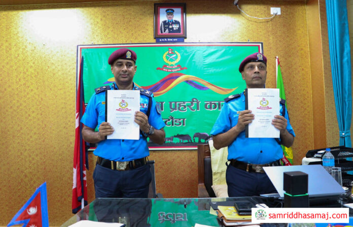 कार्यसम्पादन सम्झौतापछि फोटो खिचाउनुहुँदै मकवानपुरका प्रहरी प्रवक्ता प्रहरी नायव उपरीक्षक श्यामु अर्याल (बायाँ) ।