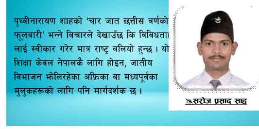 १. राष्ट्रिय एकता र विविधतामा सहअस्तित्व : विश्वभरि जातीय, धार्मिक वा साँस्कृतिक विभाजनका कारण गृहयुद्ध र हिंसा भइरहेका छन् । पृथ्वीनारायण शाहको ‘चार जात छत्तीस वर्णको फूलबारी’ भन्ने विचारले देखाउँछ कि विविधतालाई स्वीकार गरेर मात्र राष्ट्र बलियो हुन्छ । यो शिक्षा केवल नेपालकै लागि होइन, जातीय विभाजन झेलिरहेका अफ्रिका वा मध्यपूर्वका मुलुकहरूको लागि पनि मार्गदर्शक छ ।