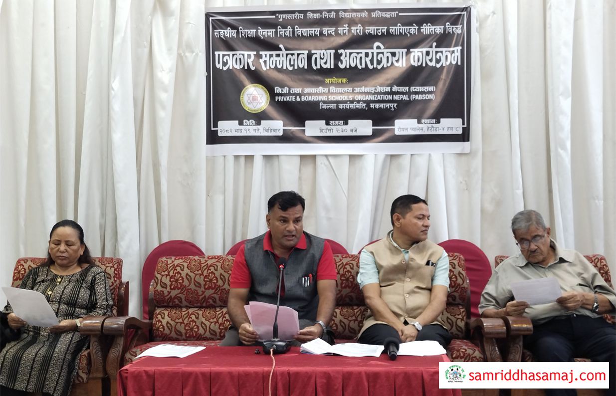 शिक्षा विधेयकमा निजी विद्यालयको हितविपरीत रहेको केही प्रावधान विरुद्ध एनएमए, अपेन, हिसान, नेशनल प्याब्सन लगायतका संगठनहरुले भदौ २७ गतेदेखि संयुक्त रुपमा आन्दोलन सुरु गरेको छ । आगामी दिनमा आन्दोलनलाई अझ सशक्त, संयमित र अनुशासित ढंगले अघि बढाई सकारात्मक निचोडमा पुर्याउन समग्र नेतृत्व प्रतिबद्ध रहेको अध्यक्ष सुवेदीले जानकारी दिनुभयो । प्याव्सन मकवानपुरका अध्यक्ष विनोद सुवेदीको सभाध्यक्षतामा भएको कार्यक्रममा केन्द्रिय सह–कोषाध्यक्ष ग्रेस श्रेष्ठ, प्रमुख सल्लाहकार मदन कुमार दहाल, नेपाल पत्रकार संघ मकवानपुरका अध्यक्ष बालकृष्ण अधिकारी, वरिष्ठ पत्रकार प्रताप विष्ट लगायतको उपस्थिति रहेको थियो ।