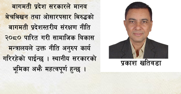 बागमती प्रदेश सरकारले मानव बेचबिखन तथा ओसारपसार बिरुद्धको बागमती प्रदेशस्तरीय संरक्षण नीति २०८० पारित गरी सामाजिक विकास मन्त्रालयले उक्त नीति अनुुरुप कार्य गरिरहेको पाईन्छ । स्थानीय सरकारको भूमिका अझै महत्वपूर्ण हुन्छ । गाउँ वा सहर स्तरमै जोखिममा रहेका परिवार पहिचान गर्ने, बिचौलियाको गतिविधिलाई निगरानी गर्ने, विद्यालय छोडेका बालबालिका वा बालविवाहका जोखिममा रहेका किशोरीलाई संरक्षण गर्ने, महिला समूह र समुदायलाई सक्रिय बनाउने जिम्मेवारी स्थानीय तहले लिनुपर्दछ । स्वरोजगार र सहकारी मार्फत आयआर्जनका अवसर सिर्जना गरेर स्थानीय सरकारले महिलाहरुलाई आर्थिक सशक्तीकरण गर्दै आत्मनिर्भर बनाउन पर्दछ । यसैगरी स्थानीय न्यायिक समितिले मानव बेचबिखन पीडित तथा प्रभावित व्यक्तिहरु एवम् उनिहरुका सन्तानमाथि लान्छनाका साथै भेदभाव भएका घटनाहरुको उजुरी लिने र सुनुवाई गर्ने गर्नु पर्दछ । स्थानीय सरकारले पीडितलाई अन्तरिम क्षतिपूर्ति, कानुनी एवम् अन्य आवश्यक सहयोग उपलब्ध गराउने गर्नु पर्दछ । पीडितबाट जन्मेका बालबालिकाको जन्मदर्ता गर्ने व्यवस्था मिलाउँदै उनीहरुलाई सरकारको तर्फबाट संरक्षण प्रदान गर्ने व्यवस्था मिलाउनु पर्दछ । यसरी तीन तहको सरकारको भूमिकाले एक–अर्कालाई परिपूरक बनाउँदै अघि बढ्दा मात्रै यो जघन्य अपराधलाई नियन्त्रण गर्न सकिन्छ ।