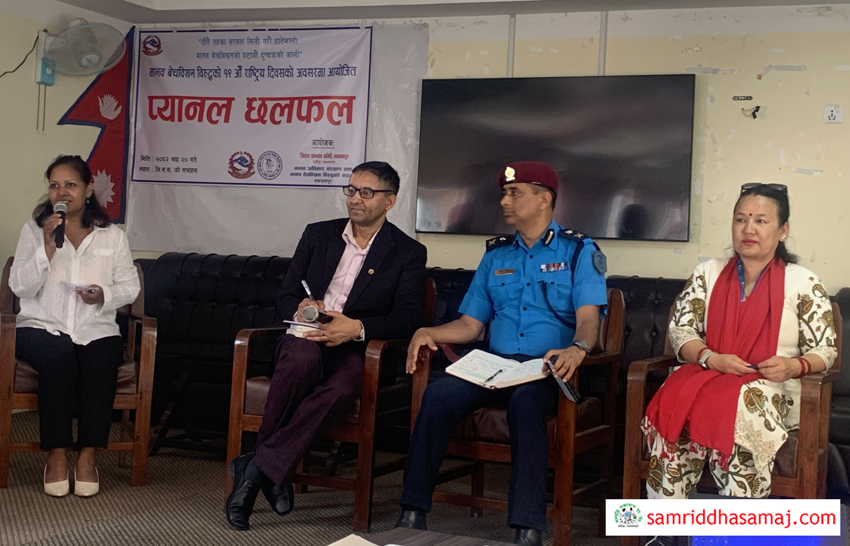 कार्यक्रममा प्रमुख जिल्ला अधिकारी स्किम श्रेष्ठले मानव बेचबिखनको स्वरुप अहिले धेरै परिवर्तन हुँदै आन्तरिक रुपमा मानव बेचबिखन तथा बैदेशिक रोजगारको नाममा मानव बेचबिखन बढेको बताउनुभयो । उहाँले पहिले बेचबिखन भन्नेबित्तिकै यौन शोषणका लागि भारतमा पुर्‍याएर चेलीबेटी बेचबिखन गर्ने भन्ने मात्र रहेकोमा पछिल्लो समय महिला र पुरुष सबैलाई देशभित्रैका व्यवसाय तथा बैदेशिक रोजगारका नाममा समेत बेचबिखन भइरहेको बताउनुभयो ।