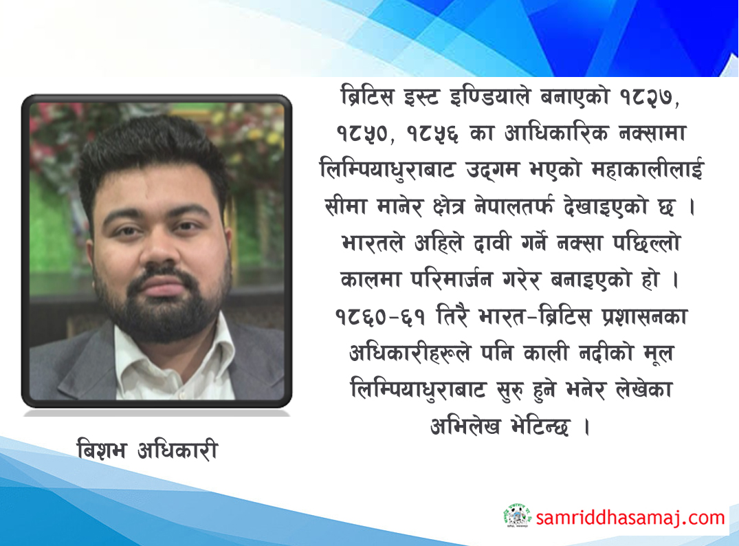 ब्रिटिस इस्ट इण्डियाले बनाएको १८२७, १८५०, १८५६ का आधिकारिक नक्सामा लिम्पियाधुराबाट उद्गम भएको महाकालीलाई सीमा मानेर क्षेत्र नेपालतर्फ देखाइएको छ । भारतले अहिले दावी गर्ने नक्सा पछिल्लो कालमा परिमार्जन गरेर बनाइएको हो । १८६०–६१ तिरै भारत–ब्रिटिस प्रशासनका अधिकारीहरूले पनि काली नदीको मूल लिम्पियाधुराबाट सुरु हुने भनेर लेखेका अभिलेख भेटिन्छ । भारत आफैले बनाएको १९५०–६० को दशकका नक्सामा समेत यो क्षेत्र नेपालतर्फ देखिन्छ । प्रशासनिक र सामाजिक प्रमाणहरूलाई हेर्दा पनि नेपालको तत्कालिन बैतडी जिल्ला (हाल दार्चुला जिल्ला) को जमिन, कर संकलन, जनगणना, गाउँपालिकास्तरका विवरणमा यो भूभाग नेपालको प्रशासन अन्तर्गत परेको उल्लेख छ । त्यहाँ बस्ने भोटिया समुदायले पनि नेपालकै प्रशासनमा कर बुझाउने गरेका ऐतिहासिक कागजात छन् । २०७६ सालमा भारतले आफ्नो नयाँ राजनीतिक नक्सामा लिपुलेक–कालापानीलाई भारततर्फ देखाएपछि नेपालले त्यस्को विरोध गर्दै आधिकारिक चुच्चे नक्सा संसदबाट पास गरेको हो । सो नक्सा ऐतिहासिक सन्धि, नक्सा र प्रमाणसँग मेल खान्छ ।