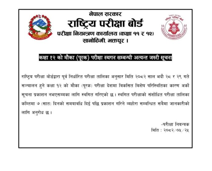 बुधबार परीक्षा नियन्त्रण कार्यालयले एउटा सूचना जारी गर्दै राष्ट्रिय परीक्षा बोर्डले पूर्वनिर्धारित तालिका अनुसार भदौ २८ र २९ गते सञ्चालन हुने परीक्षा अनिश्चितकालका लागि स्थगित गरेको जनाएको छ । स्थगित परीक्षाको संशोधित परीक्षा तालिका कम्तिमा ७ दिनको समय दिई पछि प्रकाशन गरिने सूचनामा उल्लेख छ ।