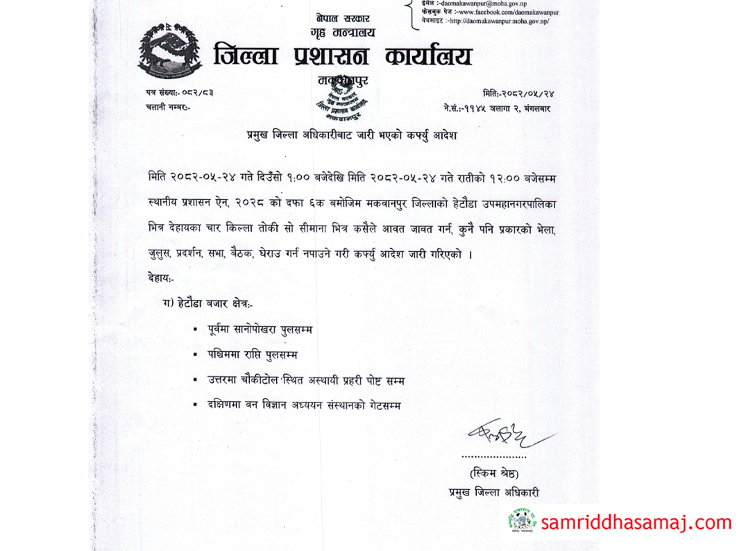 यसअघि, देशका विभिन्न भागमा देखिएको असहज परिस्थितिलाई मध्यनजर गर्दै प्रशासनले गत भदौ २६ गतेदेखि जिल्लामा निषेधाज्ञा तथा कफ्र्यु आदेश जारी गरेको थियो । प्रशासनको पछिल्लो निर्णयसँगै मकवानपुरको जनजीवन सामान्य अवस्थामा फर्कने अपेक्षा गरिएको छ ।