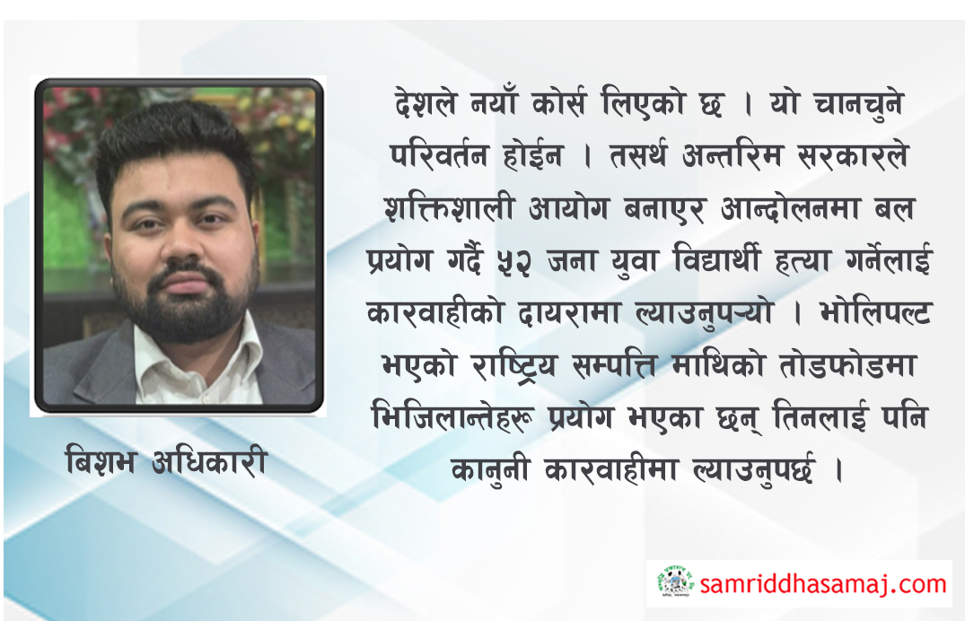 देशले नयाँ कोर्स लिएको छ । यो चानचुने परिवर्तन होईन । तसर्थ अन्तरिम सरकारले शक्तिशाली आयोग बनाएर आन्दोलनमा बल प्रयोग गर्दै ५२ जना युवा विद्यार्थी हत्या गर्नेलाई कारवाहीको दायरामा ल्याउनुपर्यो । भोलिपल्ट भएको राष्ट्रिय सम्पत्ति माथिको तोडफोडमा भिजिलान्तेहरू प्रयोग भएका छन् तिनलाई पनि कानुनी कारवाहीमा ल्याउनुपर्छ । अर्को महत्वपूर्ण काम भनेको २०४६ सालपछि बनेका उच्च पदस्थ नेता–कर्मचारी र तिनका नातेदारहरूको सम्पत्तिको छानबिन गरी तिनलाई कठधरामा उभ्याउने काम अबिलम्ब गरिनुपर्छ । लोकतन्त्रलाई आधार बनाएर जनताबाट प्रत्यक्ष निर्वाचित प्रधानमन्त्री, सानो संख्याको संसद, सांसद मन्त्री हुन नपाइने व्यवस्था, संवैधानिक निकायमा स्वतन्त्र र पारदर्शी नियुक्ति, जस्ता शासकीय संरचनामा परिवर्तन जनताले खोजेका छन् ।