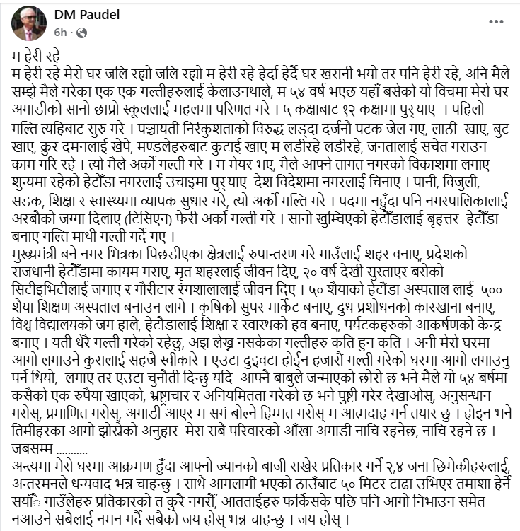 मंगलबार दिउँसोसम्ममा जेन जी आन्दोलनका क्रममा ७३ जनाको ज्यान गएको, राष्ट्रिय सम्पत्ति, राष्ट्रपति कार्यालय, सिंहदरबार, प्रधानमन्त्री कार्यालय, सर्वोच्च अदालत, राष्ट्रपति, प्रधानमन्त्रीको निजी निवास, सरकारी संरचना, आफू दुई पटक नगरप्रमुख भएको हेटौँडा उपमहानगरपालिकाको कार्यालय, नजिकैको वडा कार्यालयमा पुगेको क्षति, पूर्वप्रधानमन्त्री, परराष्ट्रमन्त्रीमाथि भएको दूव्र्यवहारमा पनि पौडेलले दुख व्यक्त गर्नुभएको छैन । तर, मुख्यमन्त्री पौडेलले आफ्नो घरमा भएको तोडफोड र आगजनीको घटनालाई मात्रै प्रस्तुत गर्नुभएको छ । अझ उहाँले आन्दोलनकारीले घरमा आगजनी र तोडफोड गरिरहँदा रोक्ने २, ४ जना छिमेकीलाई धन्यवाद दिनुहुँदै आफ्नो घरमा आगोलागी हुँदै गर्दा ५० मिटर टाढा उभिएर तमाशा हेर्ने सयौं गाउँलेहरु आगो निभाउन समेत नआएको भन्दै सबैलाई नमन गरेर आक्रोश पोख्नुभएको छ ।
