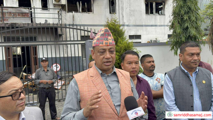 जेन जी आन्दोलनका क्रममा क्षति पुगेको बागमती प्रदेशको मन्त्रालय अगाडि सञ्चारकर्मीसँग कुरा गर्नुहुँदै मुख्यमन्त्री इन्द्रबहादुर बानियाँ ।