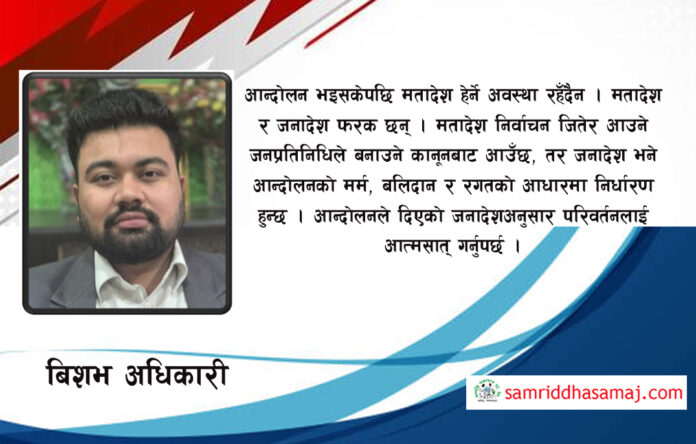 आन्दोलन भइसकेपछि मतादेश हेर्ने अवस्था रहँदैन । मतादेश र जनादेश फरक छन् । मतादेश निर्वाचन जितेर आउने जनप्रतिनिधिले बनाउने कानूनबाट आउँछ, तर जनादेश भने आन्दोलनको मर्म, बलिदान र रगतको आधारमा निर्धारण हुन्छ । आन्दोलनले दिएको जनादेशअनुसार परिवर्तनलाई आत्मसात् गर्नुपर्छ । यसमा नियम, कानून वा अन्य औपचारिक बाध्यताले रोक लगाउन सक्दैन । आन्दोलनले राखेको माग नै मार्गनिर्देशनको आधार हो र त्यसैअनुसार अघि बढ्नु नै लोकतन्त्र र वास्तविक जनशक्ति सम्मान गर्ने अभ्यास हो । नेपालमा २०४६ सालको जनआन्दोलन एउटा उदाहरण हो, त्यतिबेला जनताको व्यापक आन्दोलनले बहुदलीय लोकतन्त्र फर्काउन मात्र नभई, जडवत र गैर–जिम्मेवार शासन प्रणालीको अन्त्य गर्न जनादेश दिएको थियो । आन्दोलनको दबावमा तत्कालीन राजा वीरेन्द्रले सत्ता हस्तान्तरण गर्न बाध्य भए र नयाँ सरकार गठन भयो । यस आन्दोलनले दिएको जनादेश कानून, निर्वाचनको प्रत्यक्ष आदेश भन्दा माथि जनताको माग अनुसार शासन संरचना सुधार्नुपर्ने बाध्यता सिर्जना भयो । यदि त्यतिबेला मात्र जनमत संग्रहको मतादेश हेर्ने हो भन्ने सोच राखिएको भए, आन्दोलनको बलिदान र रगतको मूल्य बिर्सनु पर्ने थियो ।