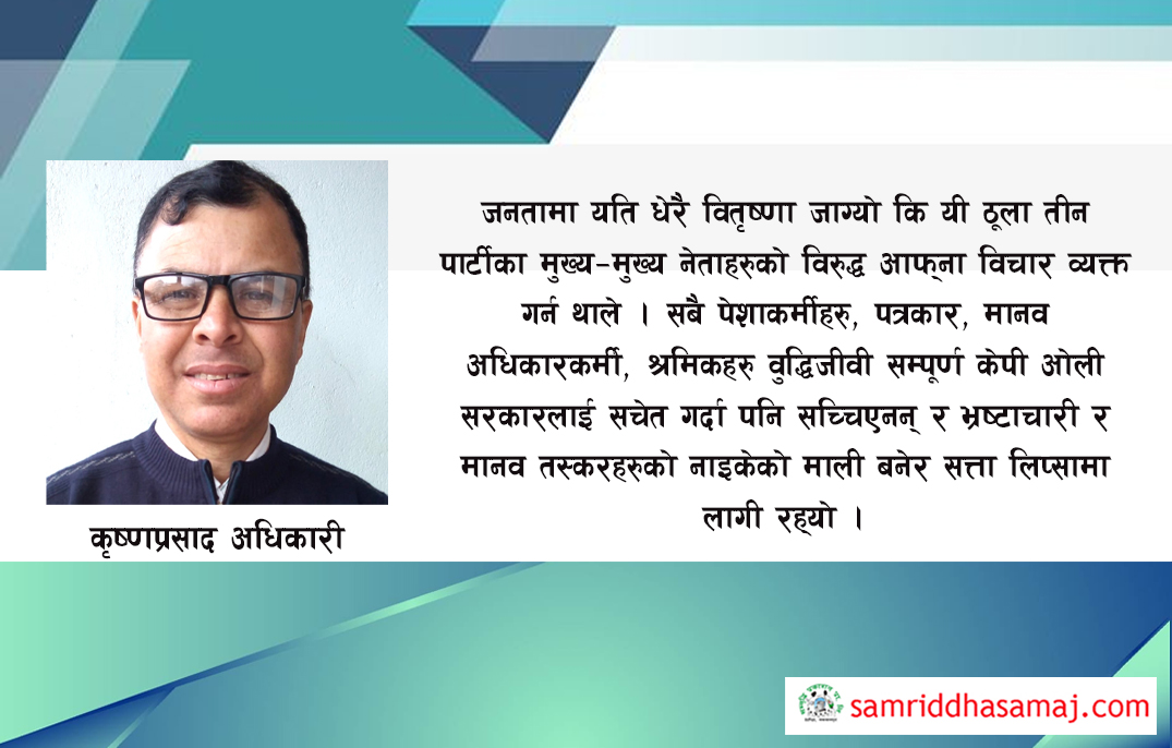 २०४६ सालमा बहुदलीय व्यवस्था स्थापना पश्चात देशमा राजनैतिक दलहरुको नेतृत्वमा सरकार गठन हुँदै आयो । हरेक एकदेखि डेढ वर्षको अन्तरमा पालैपालो सत्ताको कुर्सीमा बसेर देशको अर्थतन्त्र खोक्रो बनाई भ्रष्टाचारको दलदलमा परेर पनि अकुत सम्पत्ति आर्जन गर्न छाडेनन् । राजनैतिक पार्र्टीहरुका बुढा नेताहरुको बारेमा हरेक चिया पसल, चोक–चोकमा नकारात्मक टिप्पणी गर्दा पनि यी दलका नेताहरुले बुझ्न सकेनन् । आफ्ना नेताहरुको जीवनशैली, आलिसान घरहरु र विलासिताको सामानको प्रयोगबारे कुनै पनि दलका कार्यकर्ताहरुले खबरदारी गरेनन् र साच्चिन सल्लाह दिने आँट गरेनन् । जसको परिणाम स्वरुप भ्रष्टाचारले सीमा नाघ्यो, सार्वजनिक सम्पत्ति (भूमि) माथि नेताहरुले आफ्नो हक अधिकार जमाएर, भिजिट भिसा प्रकरणमा व्यक्तिसँग पैसा असुलेर मनमौजी गरे र यस्ता काण्डै काण्डमा नाच्न र हाँस्न रमाए ।