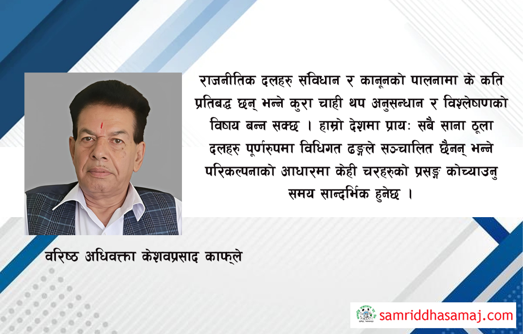 उपरोक्त कार्यहरुको पृष्ठभूमिमा नेपालका राजनीतिक दलहरुको यथार्थ अवस्थाको आँकलन गर्न सकिन्छ । राजनीतिक दल सम्बन्धी संवैधानिक व्यवस्था र तदनुकूल बनेको राजनीतिक दल सम्बन्धी ऐन २०७३ स्वयंमा सशक्त कानूनको रुपमा स्थापित भए पनि मुलुकको राजनीतिक मनोविज्ञान कानूनको परिपालनाभन्दा बढी राजनीतिलाई राजनेताको रक्षाकवचको रुपमा कसरी उपयोग गर्न सकिन्छ भन्ने चिन्ताले शासित भएको देखिन्छ । स्थापित प्रणलीको स्थायित्वभनदा बढी संविधान र अन्य प्रचलित कानूनमा अवाञ्छित छेडखानी गर्ने प्रचलन बढ्दो रुपमा देखिएको छ । यस्तै खाले अवस्थाको कारण सर्वसाधारणमा राजनीति प्रति नै वितृष्णा बढ्न जाने देखिन्छ । स्थापित दलहरुले राजनीतिक स्थायित्व प्रति उदाशिनता प्रदर्शन गरेको कारण जनमानसमा नकारात्मकताको आाभाष भइरहेको छ । अक्षम व्यक्तिहरु ठूला दलमा कुहिरोको काग जस्तो हुने केही प्राप्तीका प्रत्याशाले च्याउ जस्तै उम्रिएका नयाँ दलतिर जाने क्रम बढ्दो छ । आगामी आम निर्वाचनसम्ममा यस्तो प्रवृत्तिले राष्ट्रिय राजनीतिको समकालिन अवस्थामा केही प्रतिशत मत फरक पर्ने समेत संकेत गरिएको छ ।