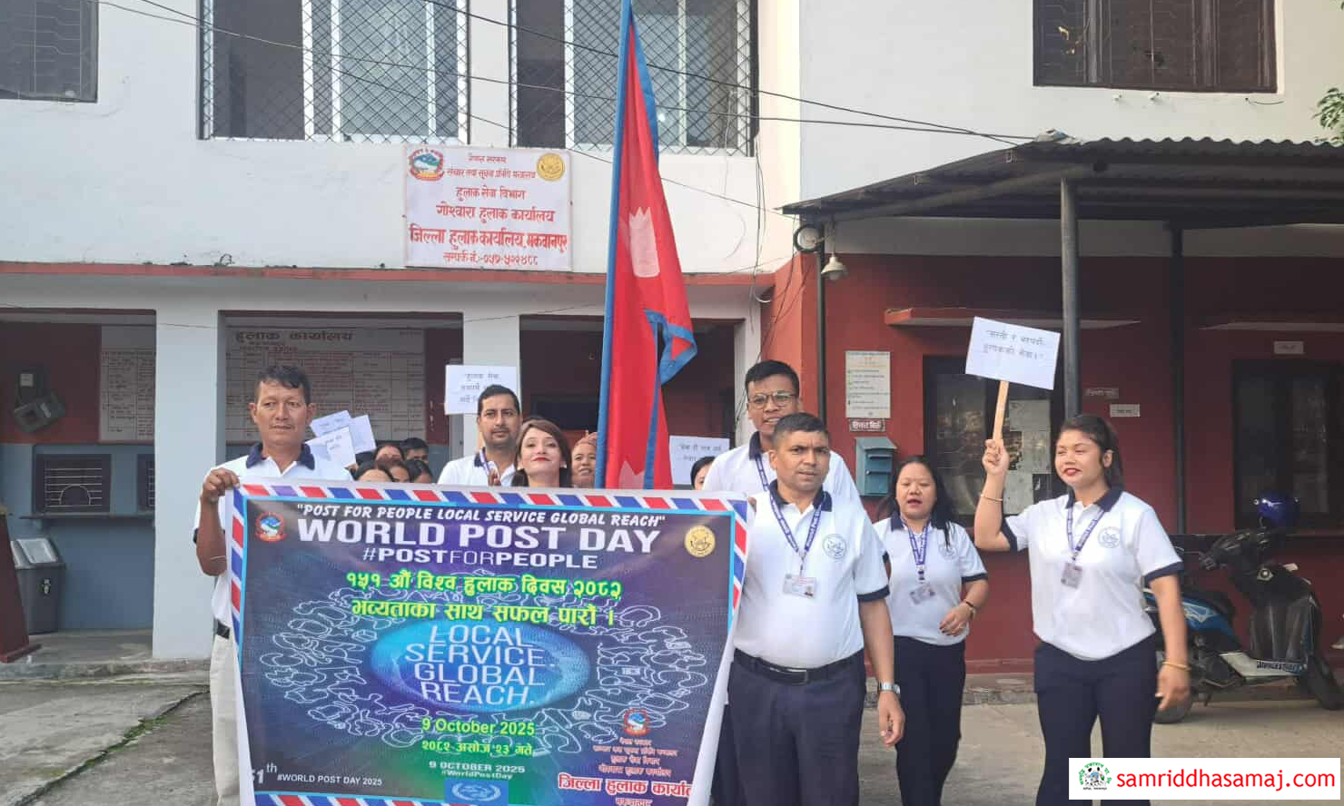 विश्व हुलाक दिवस २०२५ को नारा ‘पोस्ट फर पिपुल लोकल सर्भिस, ग्लोबल रिच’ रहेको छ । जिल्ला हुलाक कार्यालय, हुलाक काउन्टर, हुलाक कार्यालयहरू र अतिरिक्त हुलाक कार्यालयहरूमा तीन दिनसम्म सरसफाई र दीपावली गरी दिवस मनाइएको सूचना अधिकारी सिवाकोटीले जानकारी दिनुभयो । दिवसको अवसरमा असोज २१ गते हुलाक कर्मचारीहरूबीच हाजिरीजवाफ प्रतियोगिता, २२ गते व्याड्मिन्टन प्रतियोगिता र २३ गते प्रभातफेरी कार्यक्रमको आयोजना गरिएको थियो ।