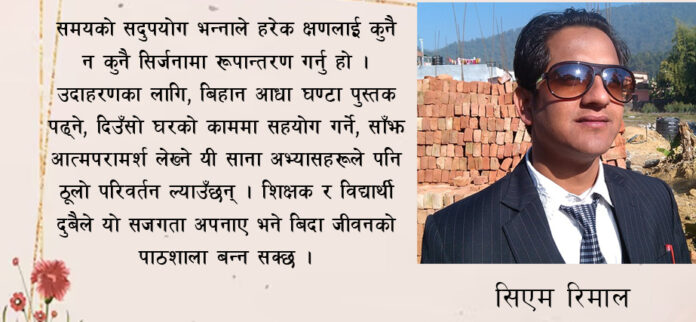 समयको सदुपयोग भन्नाले हरेक क्षणलाई कुनै न कुनै सिर्जनामा रूपान्तरण गर्नु हो । उदाहरणका लागि, बिहान आधा घण्टा पुस्तक पढ्ने, दिउँसो घरको काममा सहयोग गर्ने, साँझ आत्मपरामर्श लेख्ने यी साना अभ्यासहरूले पनि ठूलो परिवर्तन ल्याउँछन् । शिक्षक र विद्यार्थी दुबैले यो सजगता अपनाए भने बिदा जीवनको पाठशाला बन्न सक्छ ।